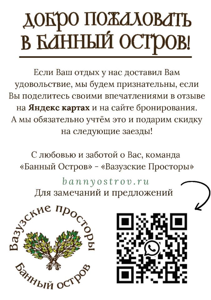 Благодарим вас за выбор Банного Острова ! Чтобы ваш отдых был максимально комфортным, просим ознакомиться с правилами заселения и выезда:Если вы планируете прибыть раньше или уехать позже — обязательно сообщите нам заранее. Мы всегда стараемся идти навстречу и найти удобное решение!